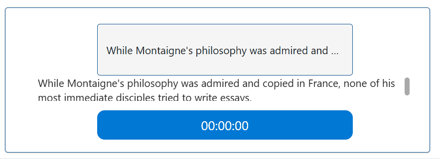 "While Montaigne's philosophy was admired and copied in France, none of his most immediate disciples tried to write essays."One label control: TextInputCanvas1, which displays the text dynamically.
